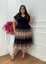 O modelo traz blusa preta com decote em V, clássico e atemporal, que alonga a região do colo e traz equilíbrio para diferentes tipos de corpo. Já a saia midi é o grande destaque da produção: com detalhes geométricos, cria um visual moderno e elegante, além de alongar a silhueta de forma sutil. Sua modelagem é levemente evasê, garantindo movimento e conforto ao caminhar.