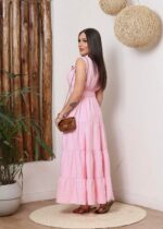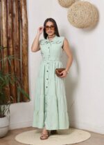 Com design moderno, ele apresenta gola clássica e recorte sem mangas, garantindo frescor e conforto para os dias mais quentes. A cintura é marcada por um cinto faixa no mesmo tecido, valorizando a silhueta de forma delicada. A saia midi é composta por camadas franzidas que adicionam movimento e fluidez (não possui forro), criando um efeito romântico e cheio de estilo.